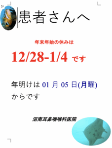 2025/12/23 改めて年末年始のお休みの連絡させて頂きます。 12/28より1/4までお休み頂きます。休み中我々も英気を養いますが、医院の清掃、エアコンのオーバーホール、電球交換等等しっかりやりますよ~。ハード、ソフト面含め新年に備えます。