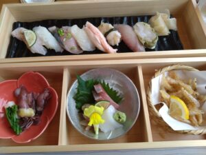あいのやま鉄道の観光列車『1300尺物語』に乗車しました。なんと列車内に寿司職員が乗車、新鮮な握りたての寿司を提供してくれます。🍣残雪の立山連峰もつまみに列車旅を楽しみました。⛰️