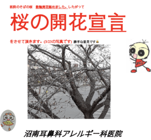 早朝に医院横の桜を観察したところ殆ど咲いていませんでしたが、暖かいせいか昼には数輪咲いておりました、ここで開花宣言させていただきます。(勝手な宣言です🙇)