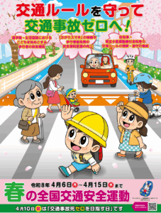 2026/04/06 春の交通安全が始まりました。この時期は新一年生等初めて通学する生徒さんを見守る意味やまた新社会人等が初めてハンドルを握るor初めての通勤路等の注意を促す意味もあるようです。特に今年は自転車も通行路変更等法令改正がありました。毎年のことですが漫然とならぬ様運転をより引き締めたいと思います。🚕